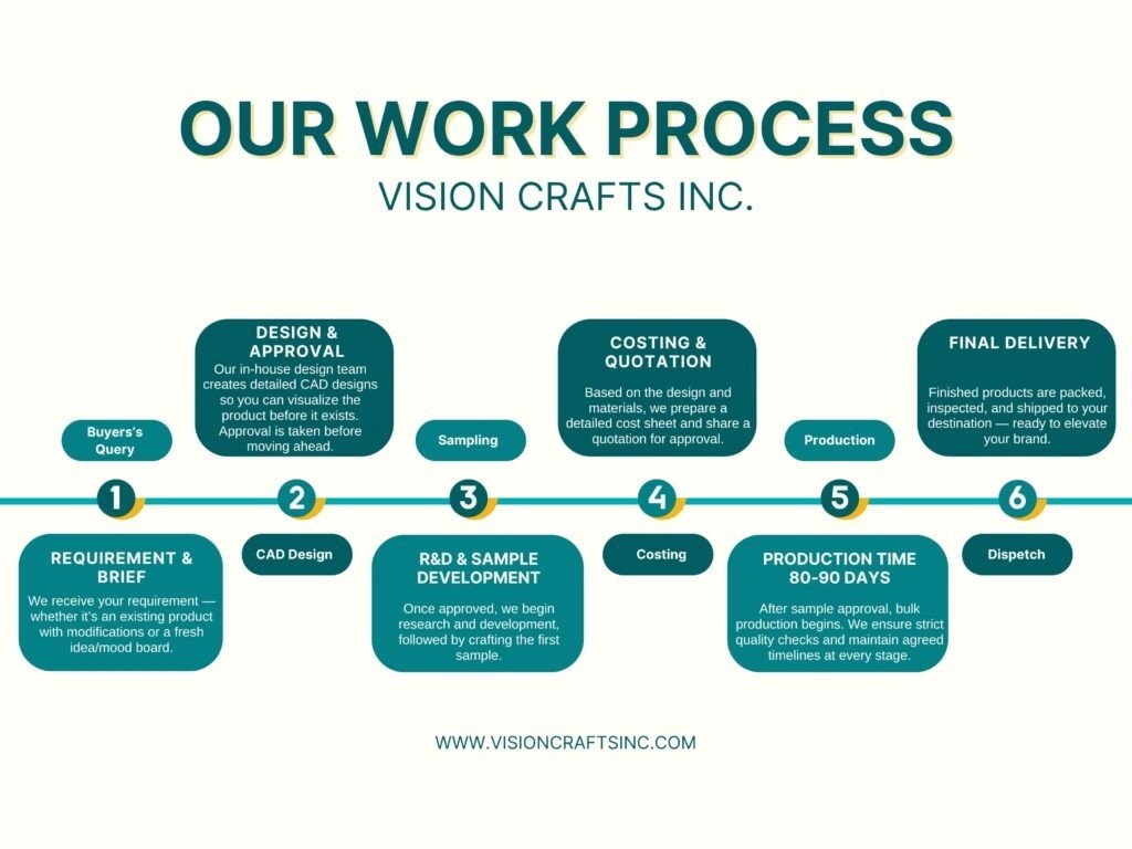 At Vision Crafts, every stage of our workflow is designed to give you clarity, control, and trust. From concept and costing to production and delivery, we ensure precision, transparency, and on-time execution — so your ideas transform into world-class products seamlessly.
